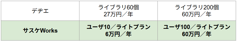 サスケWorksは、デヂエの利用ライブラリ数での料金プランとは異なり、ユーザ数による料金設定となりますが、1ユーザ500円ですので、ある程度利用ユーザ数にボリュームがある場合でも、デヂエとほぼ同様の料金で利用が可能です。