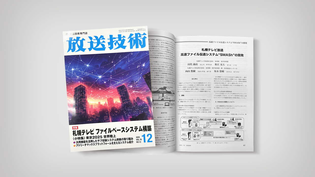 雑誌「放送技術」2025年12月号(兼六館出版)にて、弊社が提供する放送業界向け高速ファイル伝送システム開発パッケージ「SMASh(スマッシュ)」が紹介されました。