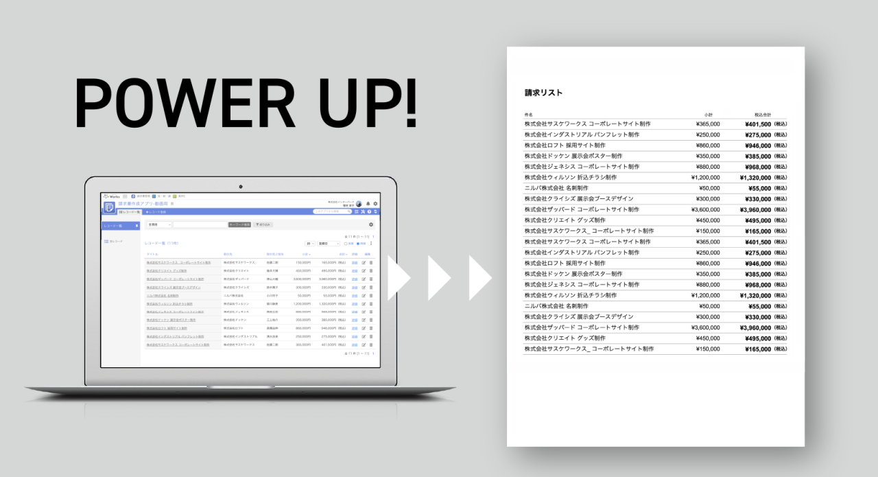 アプリのレコード一覧画面をそのまま帳票として再現できるので、報告や資料作り等で、データを「リスト」として出力したいシーンで幅広くご活用いただけます。
