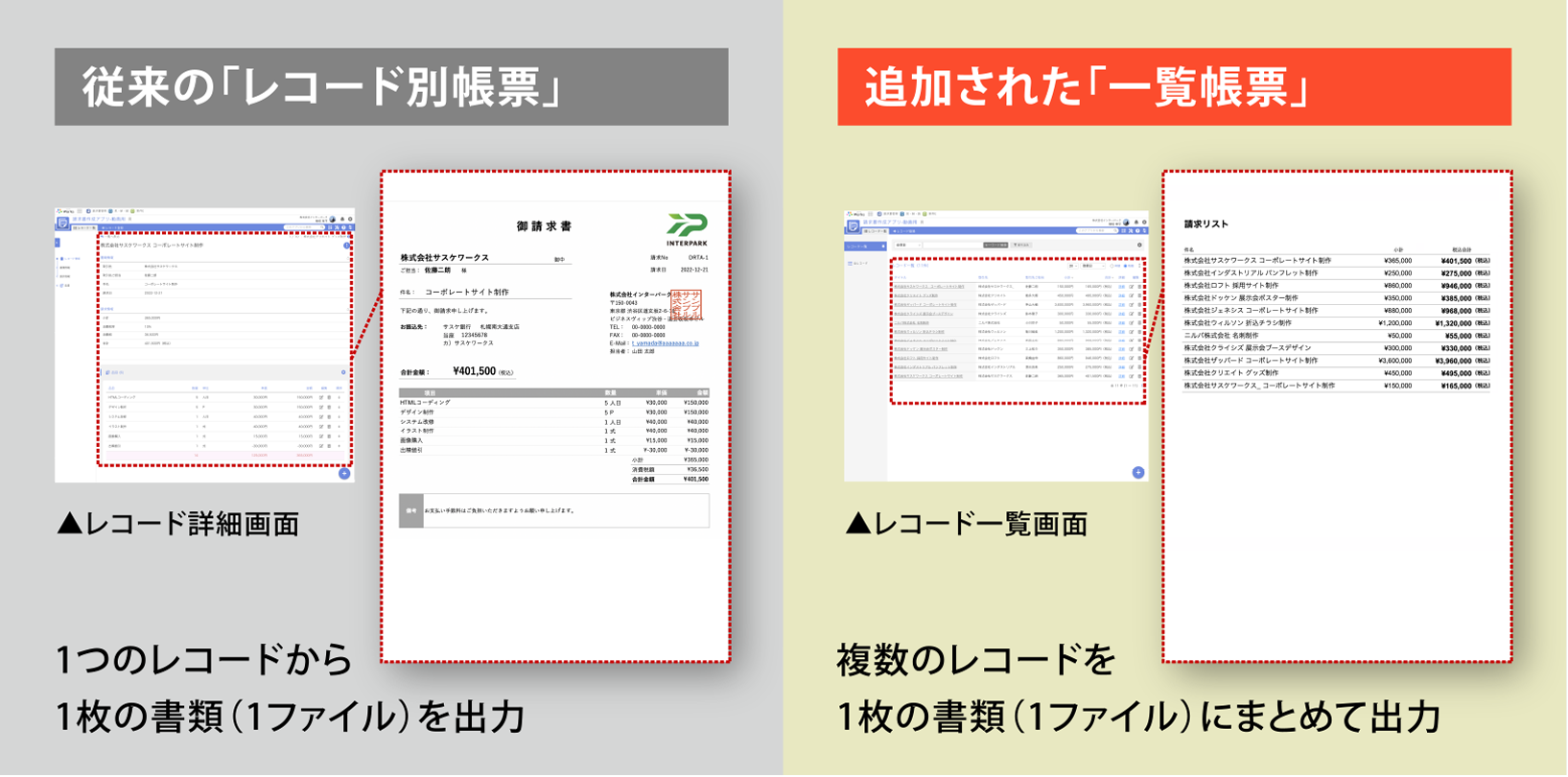 これまでの帳票機能は、1つのレコードから1枚の書類(請求書や見積書など)を作成する「レコード別帳票」のみでしたが、今回のアップデートにより、複数のレコードを1つのファイルにまとめて出力することが可能になります。