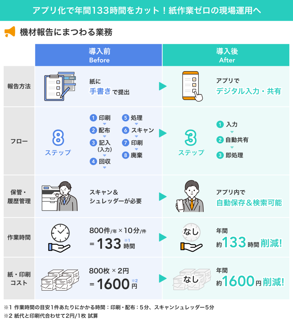 紙ベースで運用していた機材報告や作業月報を、ノーコードでアプリ化。