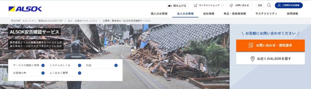 ALSOKの安否確認サービスは、2003年から提供されている業界最長クラスの稼働実績を持つ安否確認システムで、多くの災害状況下で利用されてきた信頼性の高いサービスです。