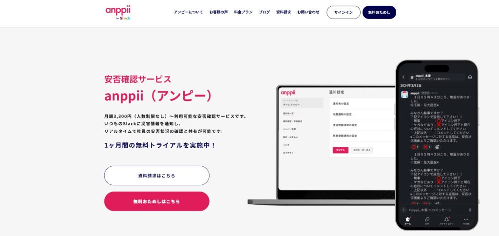 anppiiは、Slackと連携した安否確認サービスで、普段使っているSlack上で気象庁の災害情報を自動通知し、絵文字リアクションで簡単に安否状況を共有できます。